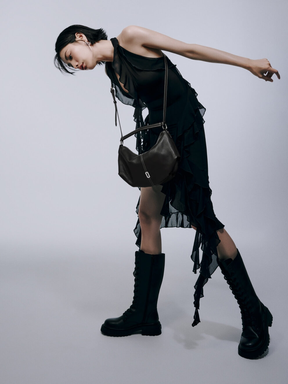 柔らかなレザーと自然なフォールディングが魅力で、肩にかけるだけで抜け感のあるシックな雰囲気に。