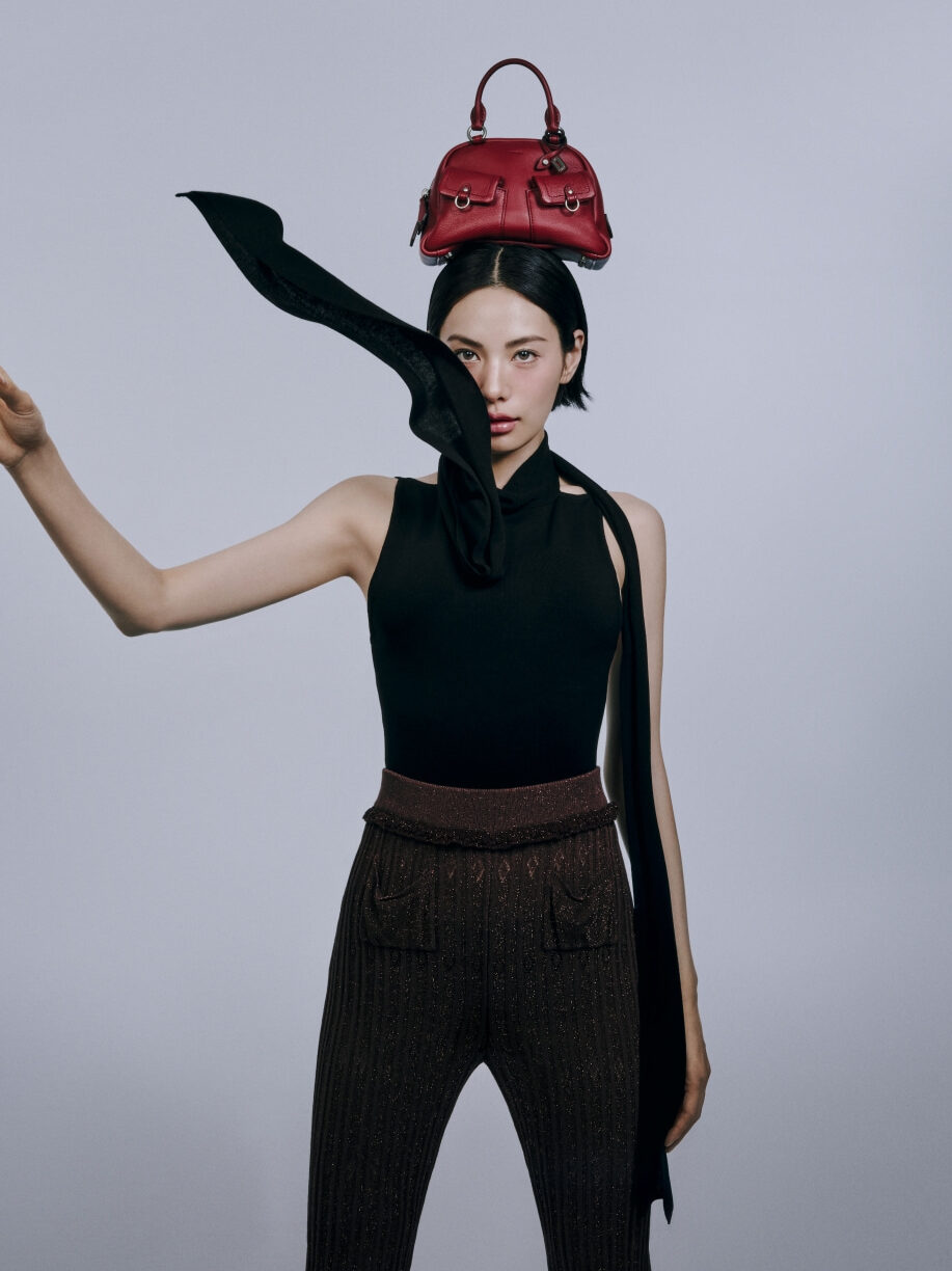 レーザーチャームが小さくても確かな存在感を放ち、ミニマルでありながらスタイルをしっかり引き締めるレッドトート。