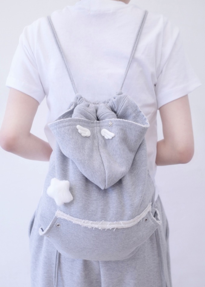 柔らかなフーディ生地の巾着バッグに小さな羽モチーフが