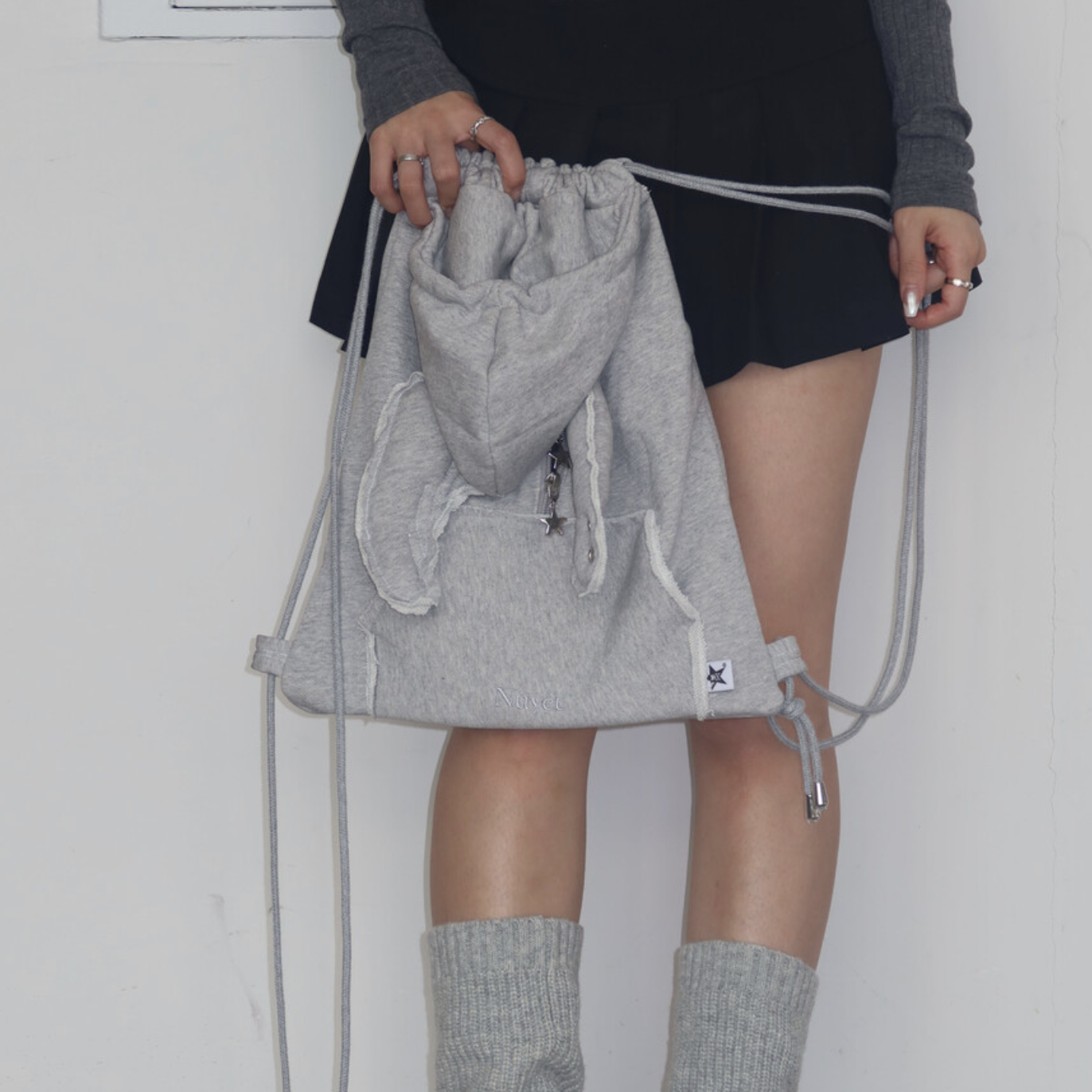 フーディ素材のキュートな巾着バッグには羽のチャームが