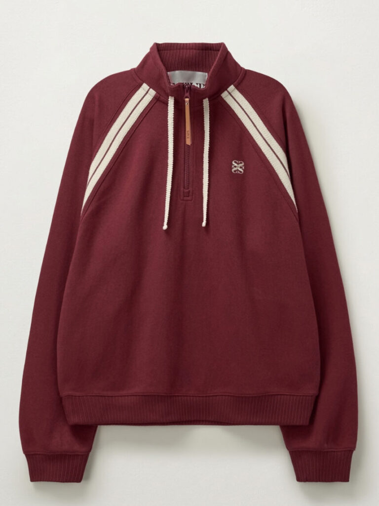 トレンド感のあるバーガンディカラーに、胸元のロゴ刺繍やフード紐のディテールが効いたジップアップスウェットシャツ。